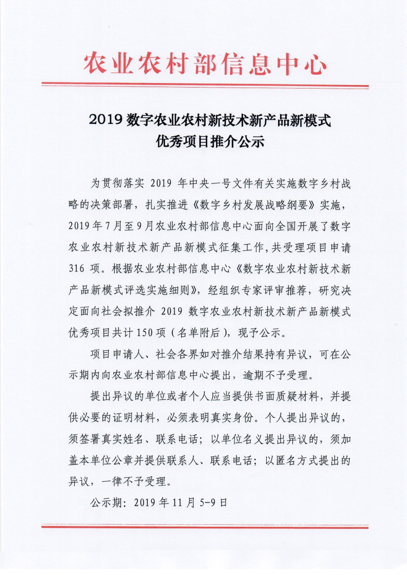 据悉,本次征集共接到项目申请316项,经专家评审研究,最终决定面向社会拟推介150项数字农业农村新技术新产品新模式优秀项目。南京绿色科技研究院有限公司作为国家级高新技术企业,致力于提供农业信息综合服务与农业大数据挖掘分析服务,以促进农村信息化及智慧农业的发展。此次得以入选《2019数字农业农村新技术新产品新模式拟推介优秀项目名单》,是农业农村部对公司一直以来在农业领域不断努力的认可。未来,我们将继续不断完善产品与服务体系,以建设数字乡村、推动乡村振兴为抓手,以农业大数据为核心动力,助力全国农业信息化水平再上新台阶。