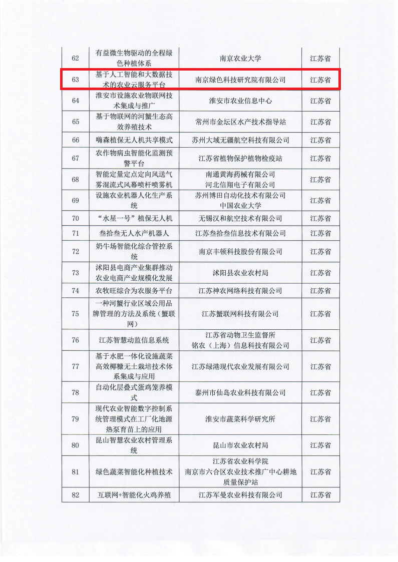 为贯彻落实2019年中央一号文件有关实施数字乡村战略的决策部署,扎实推进《数字乡村发展战略纲要》实施,2019年7月至9月农业农村部信息中心面向全国开展了数字农业农村新技术新产品新模式征集工作。11月5日,农业农村部信息中心正式发布《2019数字农业农村新技术新产品新模式拟推介优秀项目名单》,南京绿色科技研究院有限公司产品“基于人工智能和大数据技术的农业云服务平台”成功入选其中。优秀项目正式名单将在2019年全国新农民新技术创业创新博览会(2019年11月19-21日,南京)的分论坛“2019数字农业农村新技术展望论坛”上发布。